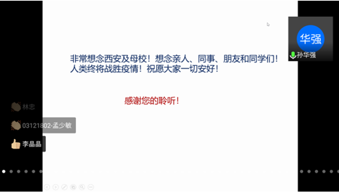 马晓川研究员图文结合,以史实为证,生动讲解了海洋国防安全对中华民族伟大复兴的重要意义,启示与会师生关心海洋、认识海洋、经略海洋。会议结束之际,他深情地说:“非常想念西安及母校!想念亲人、同事、朋友和同学们!人类终将战胜疫情!祝愿大家一切都好!”