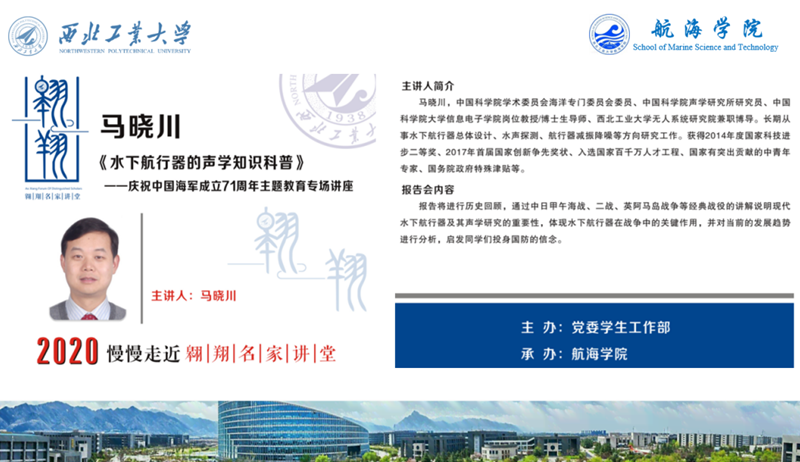 4月23日下午四点整,在人民海军成立71周年之际,中国科学院声学所马晓川研究员做客翱翔名家讲堂,为买球体育官方网站的师生们作了一场题为《水下航行器的声学知识科普》的专题报告。本次报告由买球体育官方网站党委书记孙华强老师主持,党委副书记王银涛老师及300名研究生和本科生共同参加。