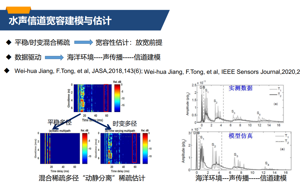童教授结合自身科研成果,详细地讲解了水声信道宽容性建模与估计的研究方法和思路,从不同信道估计策略的优缺点、复杂时间-空间-频率变参的海洋环境、海洋多径结构特征等方面对海洋水声通信过程的难点和解决思路进行了比较全面的讨论。通过对海洋环境下声传播构建相应的平稳/时变混合稀疏信道模型,深入分析了宽容性估计的方法和意义。