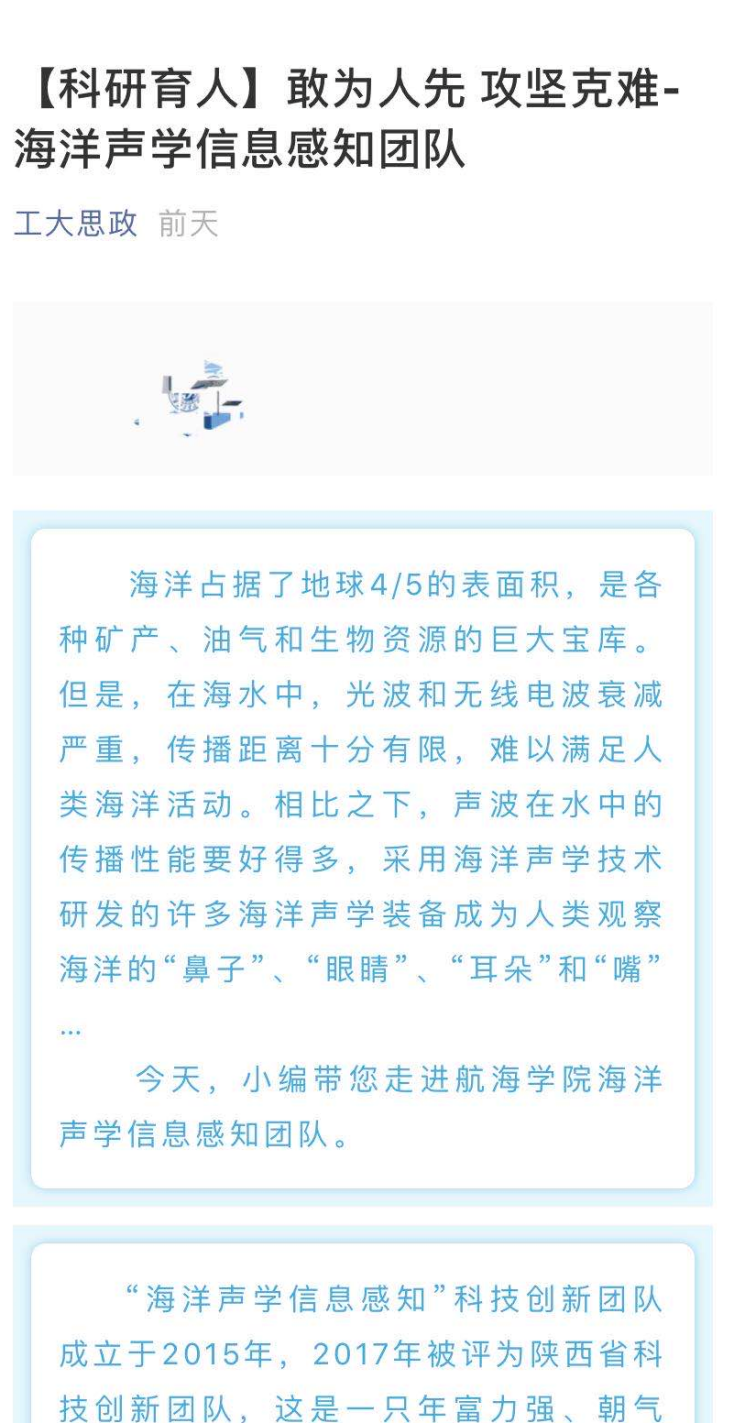 “海洋声学信息感知”科技创新团队成立于2015年,2017年被评为陕西省科技创新团队,这是一只年富力强、朝气蓬勃、积极向上、奋发有为的年轻团队,也是体现“敢为人先、攻坚克难、团结协作、无私奉献”航海精神的优秀团队。