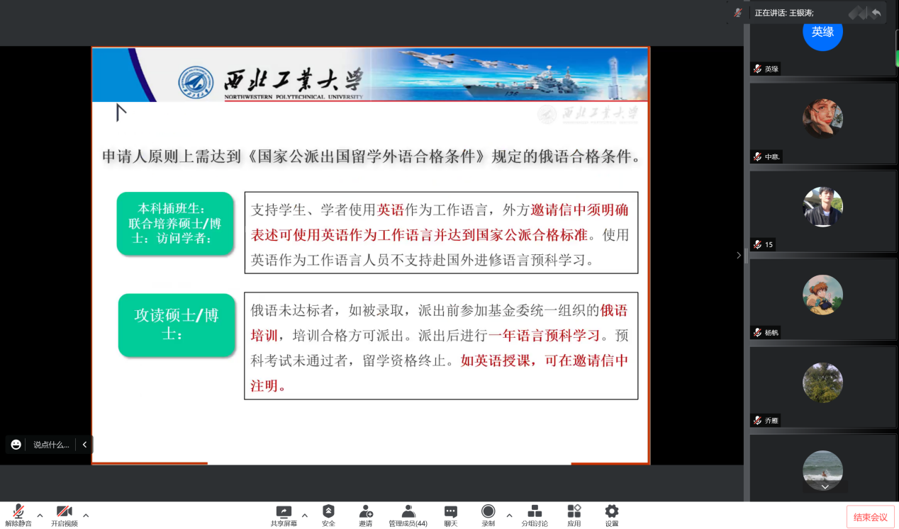 王银涛首先介绍了项目获批情况,随后从国家战略需求、学科发展背景、项目建设必要性以及与俄前期合作基础和成果等方面介绍了本项目整体情况。王银涛鼓励同学们多多申报,主动跟导师、同学、学院沟通,提高自己的综合能力。学院会在经费支持、项目申报等方面提供帮助,助力同学申报成功。