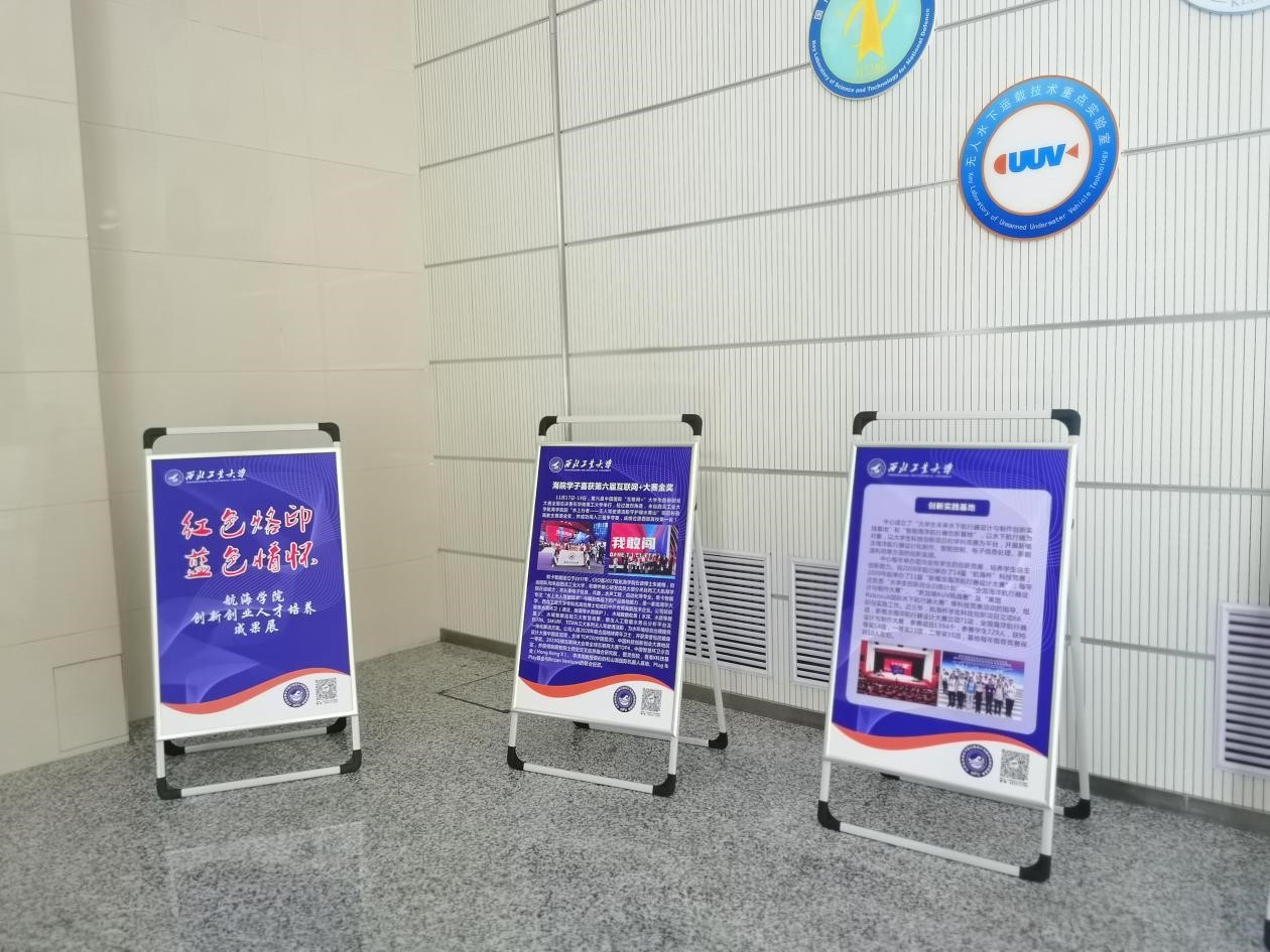 在长安校区水池实验楼一楼大厅,举办了“红色烙印、蓝色情怀——买球体育官方网站创新创业人才培养成果展”,展示学院近几年双创工作上的成绩、学生竞赛奖项,介绍优质项目情况,展示学生风采。