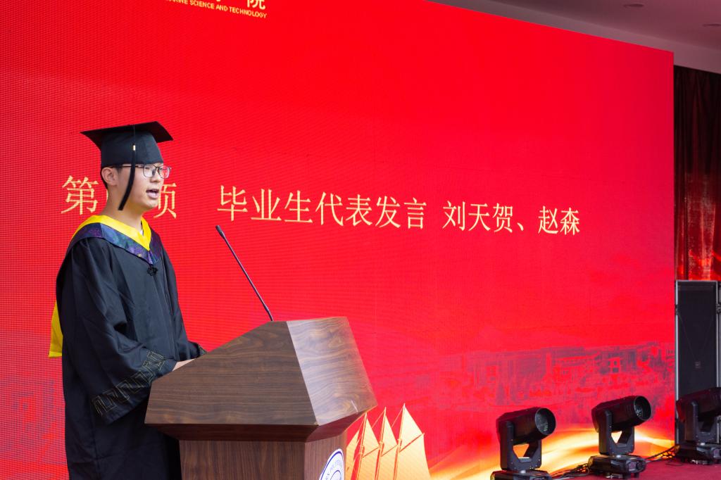典礼第四项,毕业生代表刘天贺、赵森代表所有毕业生表达了对学院与老师四年辛勤教育的感谢,作为买球体育官方网站的一员,今后将会秉承学院精神,为祖国海洋科技事业做出自己的贡献。