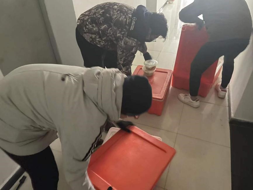 在校内,团队成员积极响应学校学院号召,不仅在基础防疫工作中担任志愿者,例如自觉担任送餐服务志愿者、洗浴值班志愿者、出门检查票据志愿者等。同时还报名参加学校紧缺岗位的机动志愿服务,参与学校防疫工作,例如核酸检测志愿者,食堂值班志愿者,生活和防疫物资发放志愿者等等。而这繁琐却不平凡的志愿服务,也锻炼了党员同志的心智。
