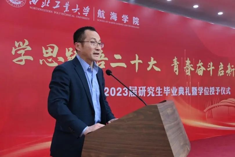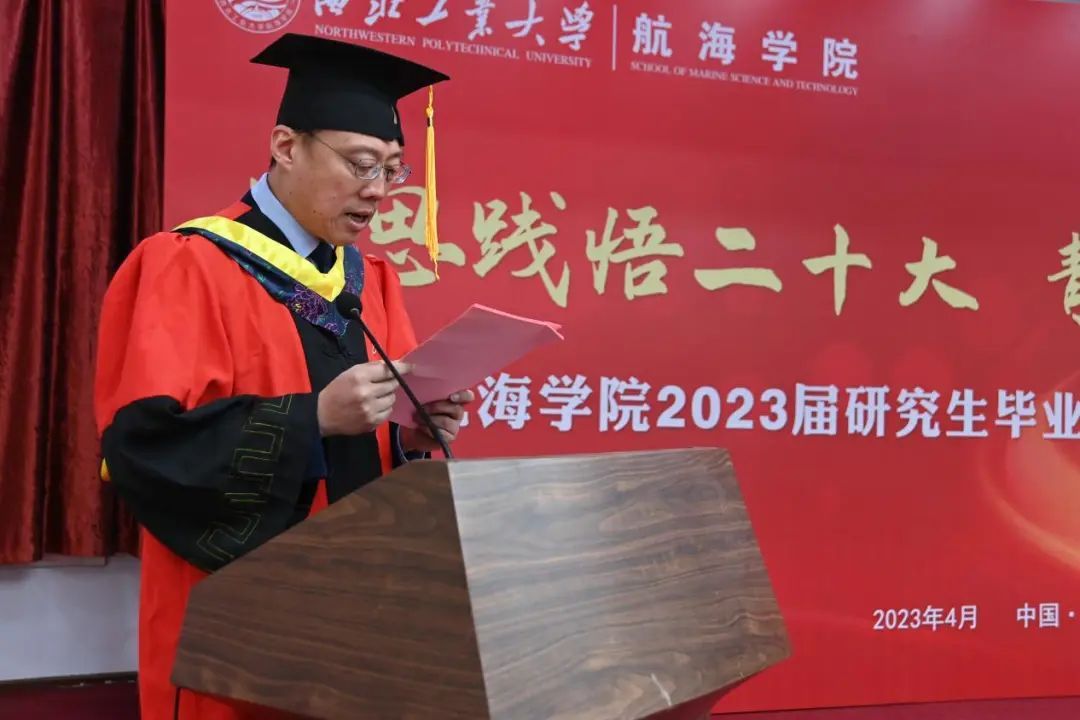 “士不可以不弘毅,任重而道远”“路漫漫其修远兮,吾将上下而求索”。典礼进行第七项,潘光院长致辞。潘光回顾了学院近年来取得的辉煌成就,见证了2023届研究生在校期间经历的大事件,肯定了海院学子的责任与担当。同时潘光寄语毕业生要心怀“国之大者”,立家国天下之志;要坚定矢志奋斗,明永不言弃之理;要担当时代之责,成顶天立地大事。最后,祝毕业生们都能实现更高的成就与价值,常回家看看,祝大家毕业快乐、前程似锦。