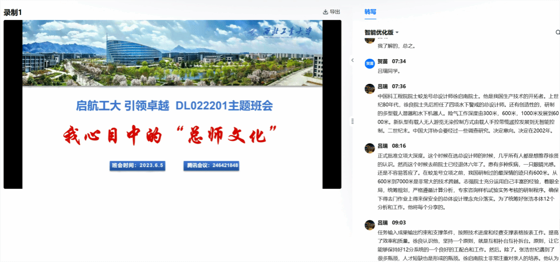 首先是班长薛添予进行分享,他主要说了徐德民院士的事迹以及自己对总师文化的感悟,认为总师需要三个优点:过硬的科研能力、广阔的国际视野、较强的协调能力。