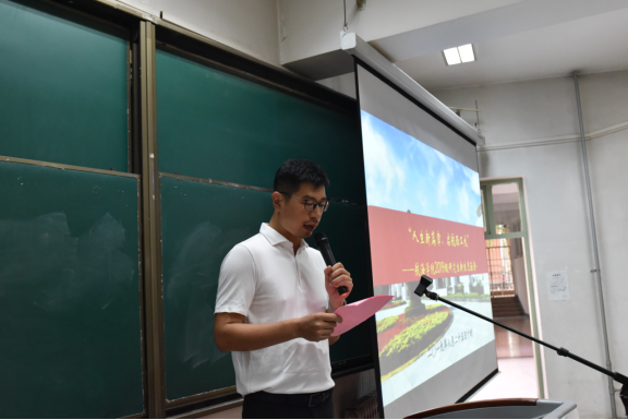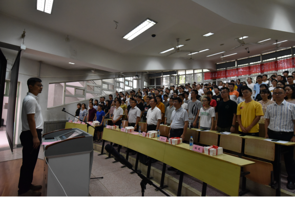 仪式开始前,全体新生观看了反映我校建设成就的短视频。见面会暨赠书仪式第一项,全体师生起立齐唱国歌,整个会场气氛庄严肃穆,歌声嘹亮,气势磅礴。第二项,潘光院长发表了热情洋溢的欢迎词。他代表学院党委、机关及全体教职工,向2019级研究生新生的到来表示热烈欢迎,并向同学们介绍了学院的基本情况,回顾了近年来学院在学科建设、教学科研、人才培养、创新创业、对外合作等方面取得的成绩,并引用现代诗句作为结束语与同学们共勉——“未来,就是你站在茫茫大海的这一边,遥望着海的那一边,充满好奇心,憧憬这对海那边的向往,正是对未知的不了解与向往,所以才有了去追逐未来的勇气”。