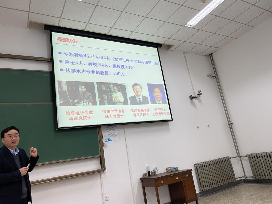 首先,杨老师回顾了水声工程专业发展历程,从水声工程学科点组建,历经招收本科生、招收研究生、获得博士授予权、获批国家重点学科、获批船舶与海洋工程一级学科点等历程,水声工程组建起一支优秀的师资队伍,师资力量雄厚。水声工程具有鲜明的学科特色,以创建一流船舶与海洋工程学科为目标,以服务国家海洋强国战略要求、实现跨越式发展为宗旨,以服务海洋、开放海洋、保护海洋为宗旨,为海洋科技发展提供科技支撑。
