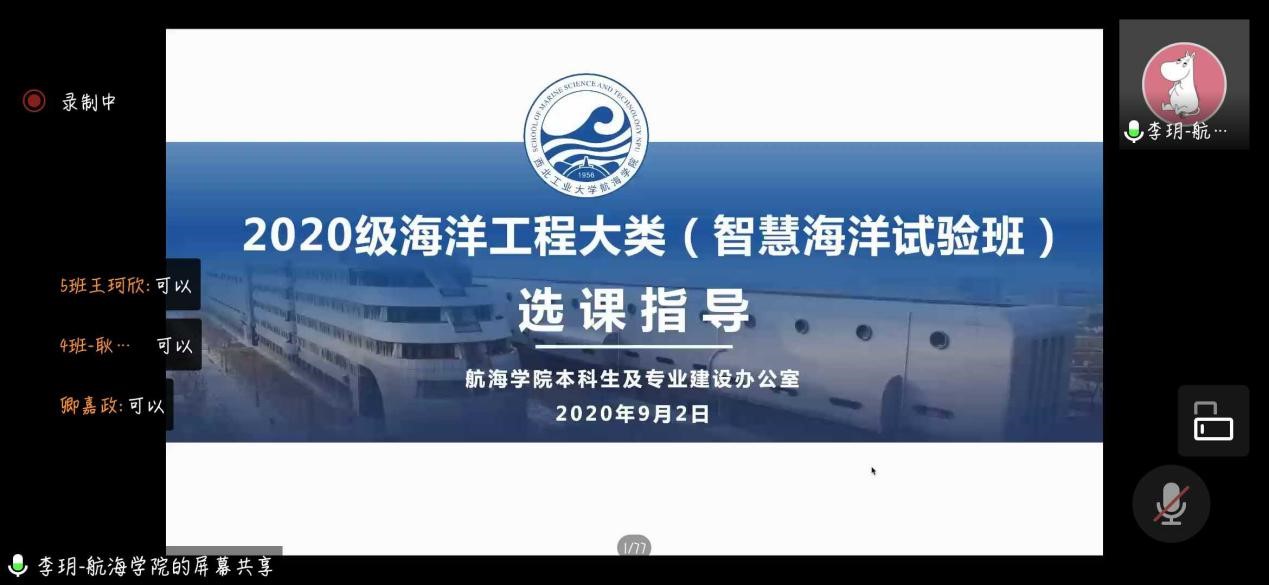 迎新已毕,海洋工程大类2020级新生已开始扬帆启航。学院为同学们制定了细致的护航方案,第一项工作便是选课指导。9月2日晚,学院本科教学副院长曾向阳、教学办李玥、李海燕老师、辅导员崔晓东、及各班班主任与200余名学生、学生助理一起参加了选课指导在线会议。曾向阳副院长首先发言,简要介绍了海洋工程大类课程体系和培养特色,并针对选课提出了几个方面的要求和注意事项。然后由李玥老师就选课基本政策、海洋工程大类培养方案、选课基本原则、体育与健康及语言类方案解读、建议修读课程五个方面进行了详细讲解和指导。
