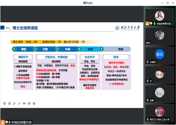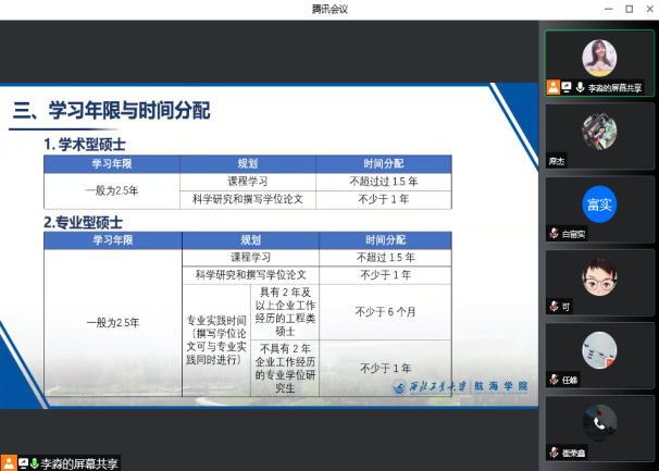 随后,研究生秘书席杰、罗钰、李淼详细从招生、课程学习、论文开题、中期考核、学位申请等研究生培养环节的一些关键事项展开培训。