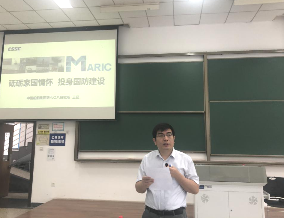 2021年5月29日上午10:30,在长安校区教西D106教室迎来“感悟深蓝”课程第三讲,由买球体育官网杰出校友、中国船舶集团公司第七〇八研究所党委副书记(主持工作)、副所长王征面向买球体育官方网站2020级本科生主讲,主题为《砥砺家国情怀,投身国防建设》。买球体育官方网站副院长曾向阳全程听课,并在课前详细介绍了王征同志的个人事迹。